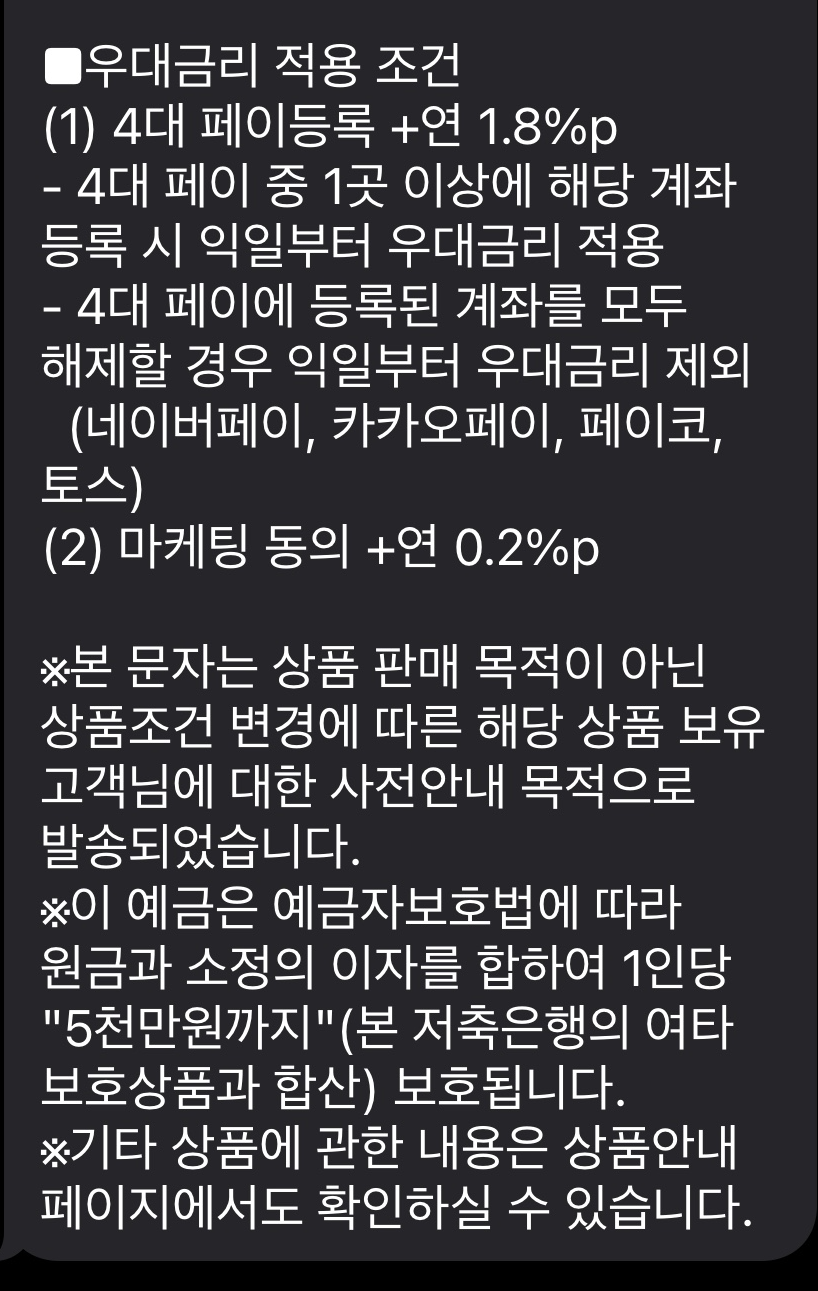 - 우대금리 조건 변경 | 4대 페이 등록 시 1.8% 우대, 마케팅 동의 시 0.2% → 최대 2%
