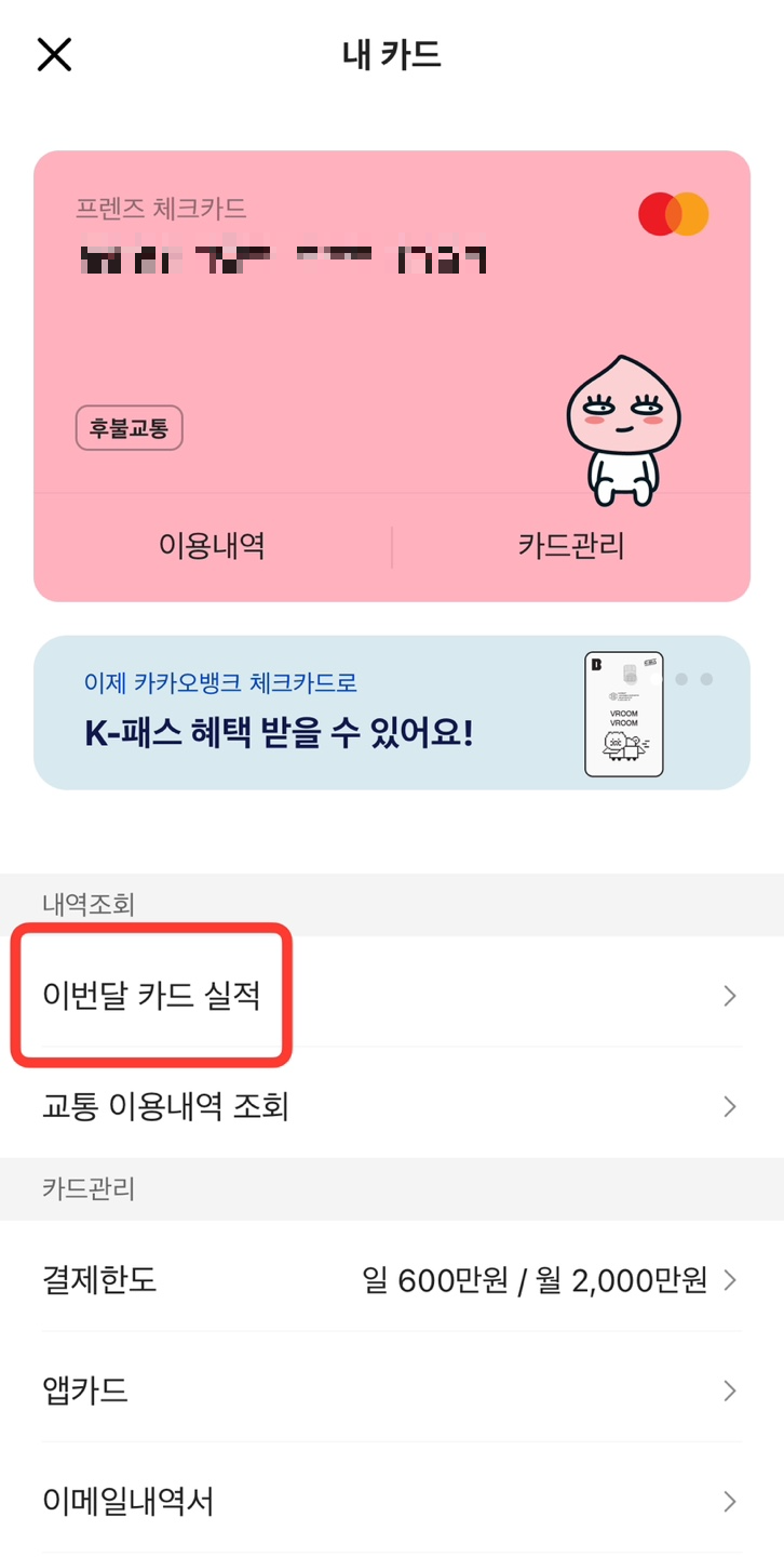 2022년에 카카오뱅크 체크카드 발급 후 해지한 적이 있는데, 이번에 프렌즈 체크카드 발급 시 첫 달 실적유예 혜택을 받지 못했습니다. 고객센터에 알아보니 프렌즈 체크카드 첫 발급이더라도 이전에 카카오뱅크 체크카드 발급 내역이 있으면 첫 달 혜택을 받지 못한다는 안내를 받았습니다.