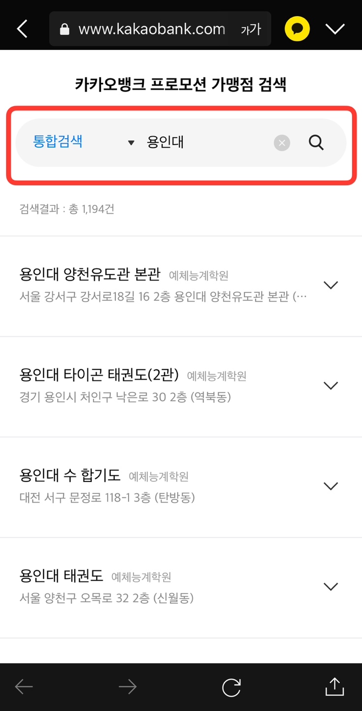 카카오뱅크 프로모션 가맹점 링크로 들어가서, 통합검색창에 학원명 키워드를 입력하시면 리스트가 쭉 나옵니다. 저는 피아노, 태권도 중 할인을 받을 예정이라 '용인대'라고 검색해 봤는데요. 학원이 1,194개나 나왔습니다. 아이가 다니는 학원도 리스트에 있어서 이번 달 혜택을 받을 예정입니다.