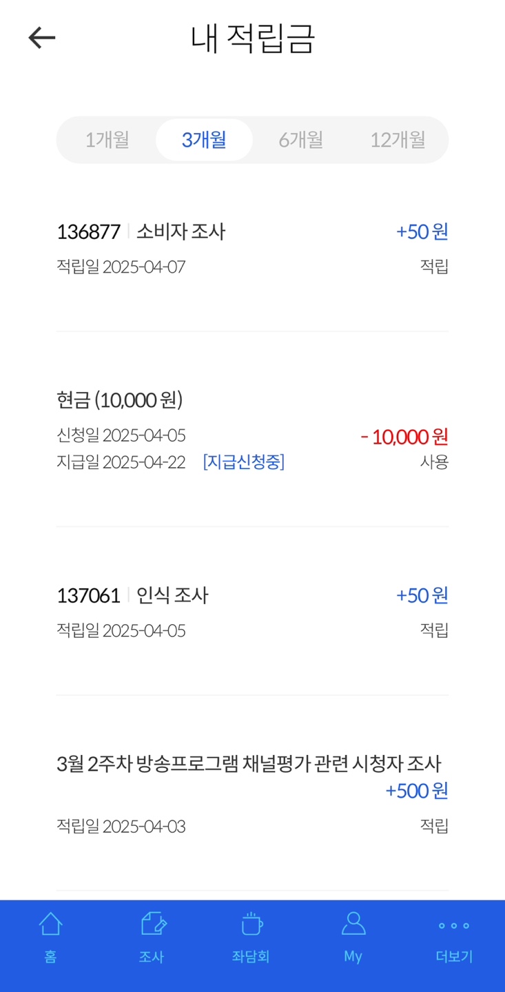 위의 적립 내역에서 확인할 수 있듯이 일주일에 설문 참여 빈도가 2~3회 정도 됐던 것 같습니다. 50원 적립은 설문 대상이 아니어서 1~2분 정도 응답한 게 전부이고, 나머지만 설문에 참여한 건데요. 진짜 긴 설문은 20분이 넘어갈 때도 있지만, 보통은 10분 이내로 끝낼 수 있습니다.