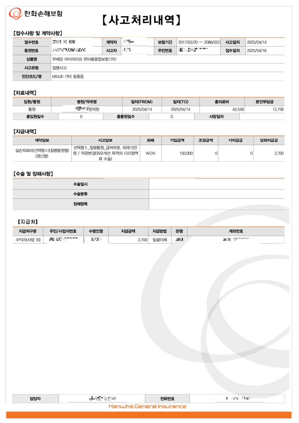 최근 어깨, 등, 견갑골 통증으로 한의원 진료를 처음으로 받았습니다. 진료와 물리치료, 침 치료를 받았는데요. 당연히 실비가 되지 않을 줄 알았는데 실비 보상이 가능하더라고요. 제가 가입한 보험은 2017년에 가입한 한화손해보험 무배당 마이라이프 한아름 종합보험입니다.