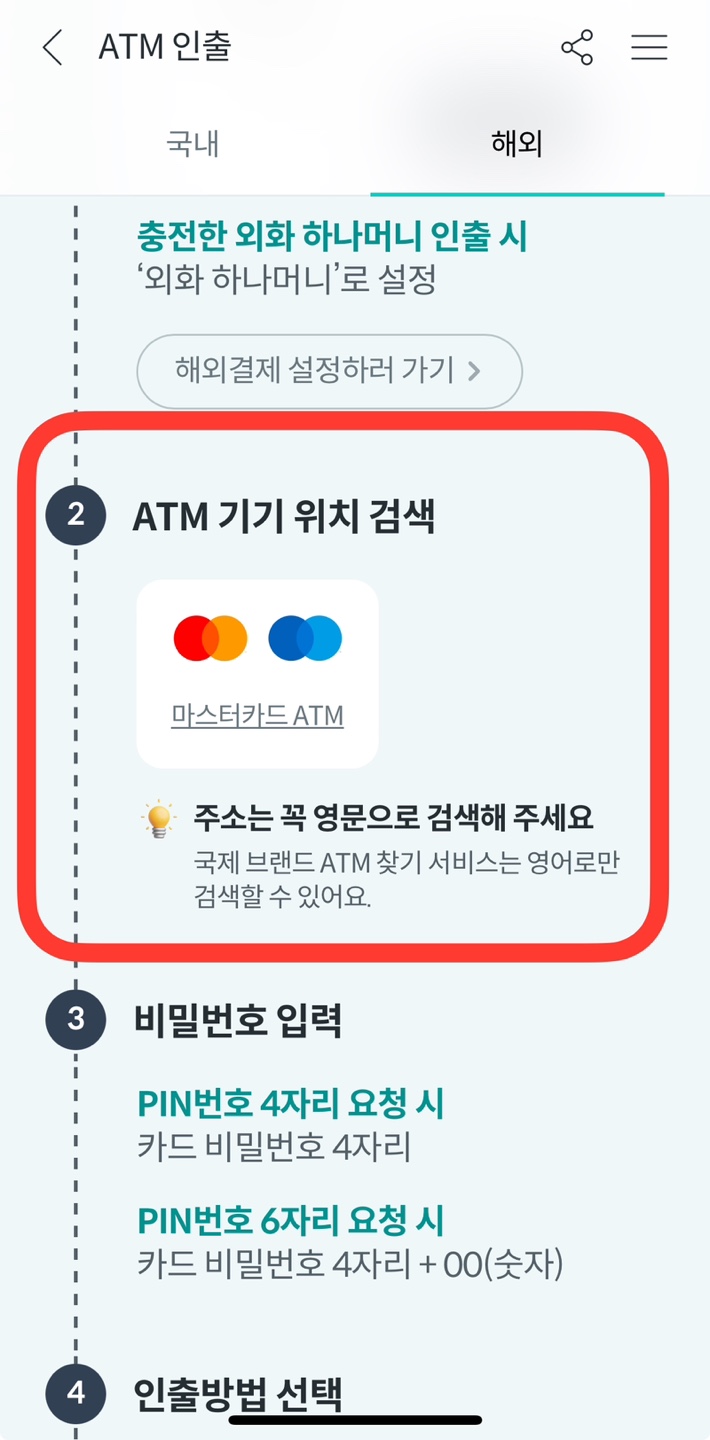 전체메뉴> ATM인출> 해외탭> ATM기기 위치 검색 영역 '마스터카드 ATM 찾기'