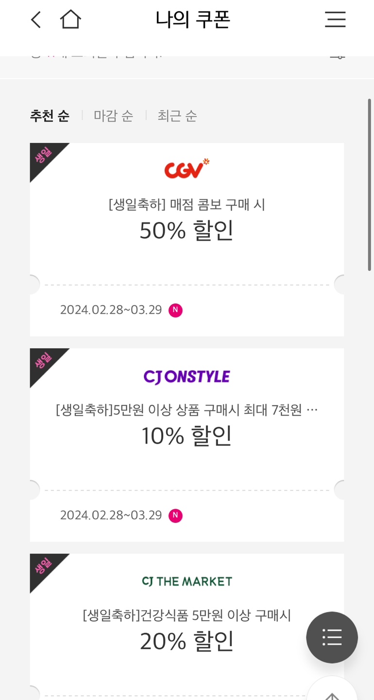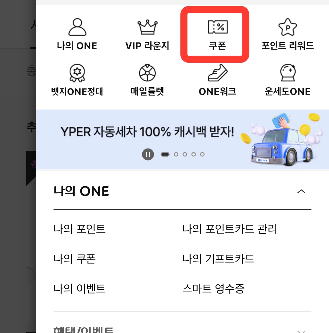 CJ ONE앱 메인 우측 상단 줄 세 개를 누르시면 '쿠폰' 카테고리가 보이실 겁니다. 쿠폰을 눌러주세요. 혹은 아래쪽 '나의 쿠폰'을 누르셔도 쿠폰함으로 이동합니다. 저는 빕스 쿠폰을 사용해서 현재 쿠폰함에서 보이진 않지만 생일이라면 자동으로 빕스 쿠폰이 들어와 있습니다.