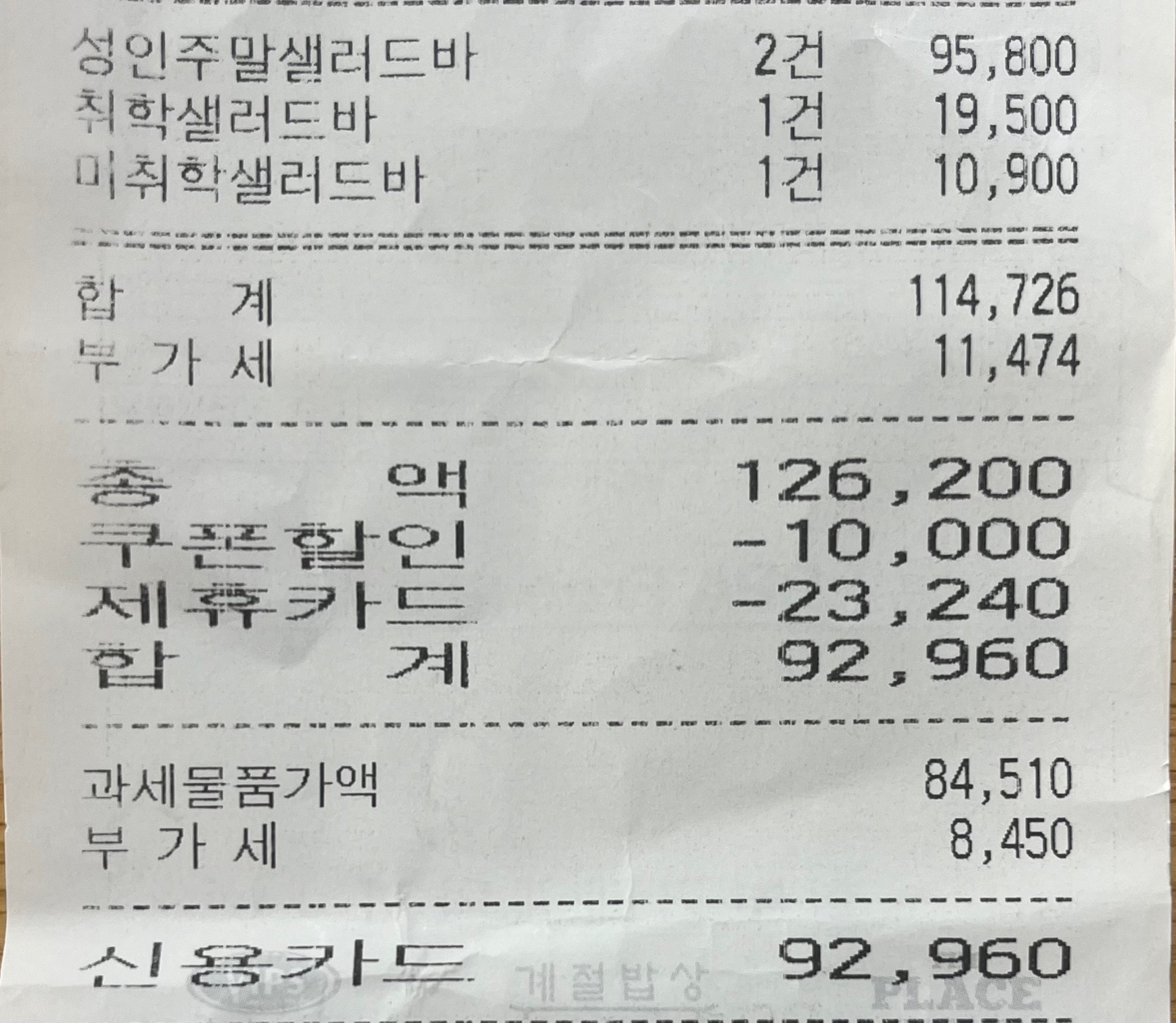 위의 영수증을 보면 알 수 있듯이 쿠폰할인 1만 원을 제한 금액에서 20% 할인이 적용됩니다. 116,200원에서 20%인 23,240원을 할인받을 수 있었습니다.