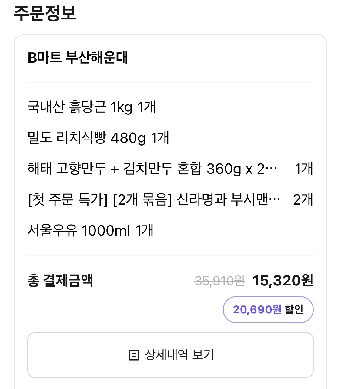 보시다시피 상당히 많은 상품을 주문했는데, 저렴하게 장을 봤습니다.