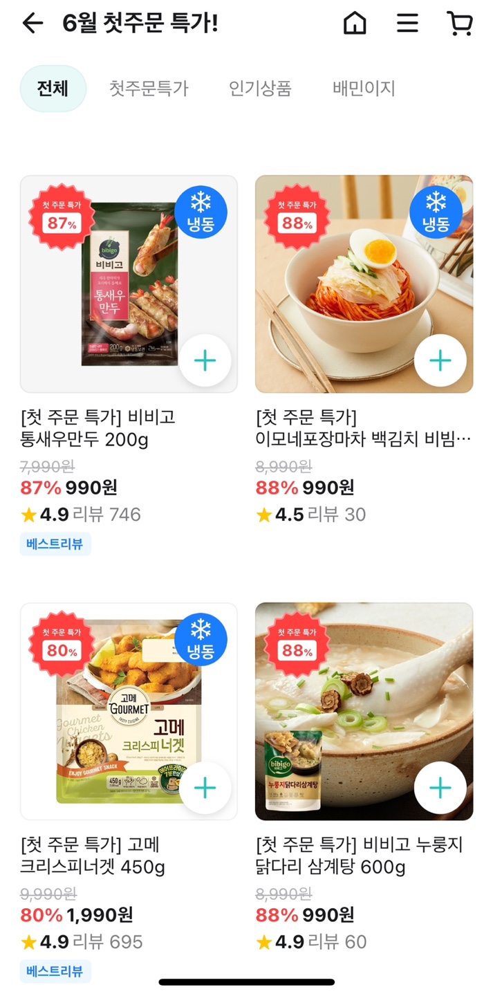 배민 B마트 첫 주문 특가 상품은 따로 카테고리가 있습니다. 상품명 앞에 [첫 주문 특가]라고 표기되어 있어요.
