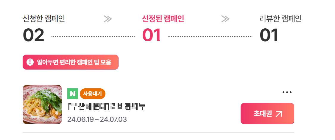 하나는 이미 리뷰를 끝냈고, 이틀 전 당첨된 레스토랑 리뷰를 남겨두고 있습니다. 특히 이 곳은 제가 평소에 꼭 해 보고 싶었던 곳이라 더 기분이 좋았어요. 체험단을 선정할 때 업체에서 한 번에 모든 인원을 모집하지 않고, 여러 번 나눠서 모집합니다. 이때 첫 모집일 경우 지원자가 많아요. 그러나 뒤로 갈수록 줄어들게 됩니다.