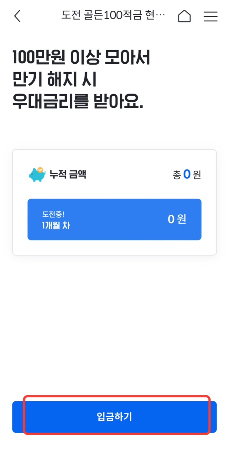 도전 골든 100 계좌 하단의 '입금하기' 선택 후 다시 한번 '입금하기'를 눌러줍니다. 다음 달부터는 계좌 연결 과정이 생략되므로 지금 과정부터 반복하면 됩니다.
