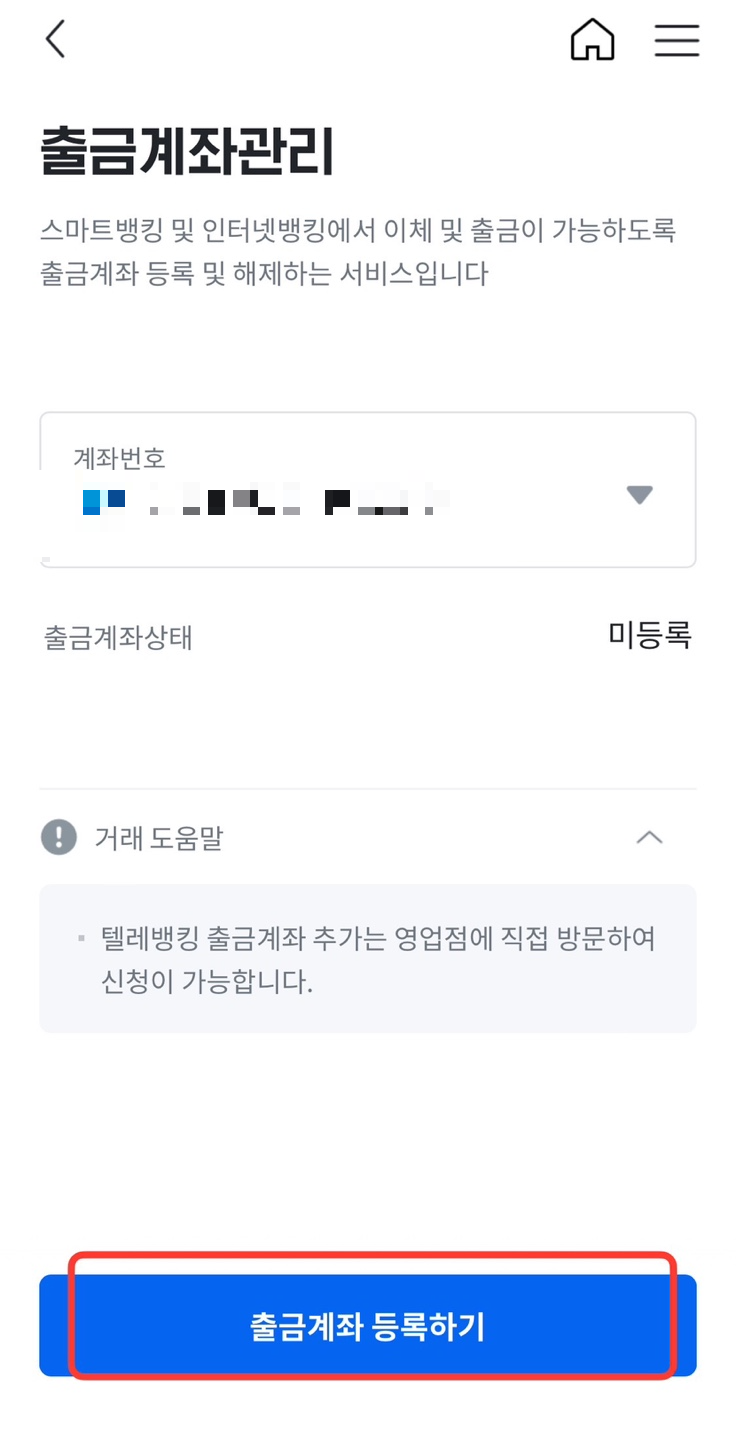 우측 상단 '계좌관리'>'입출금 계좌' 선택> 하단 '출금계좌 등록하기'까지 선택하면 출금계좌 등록이 완료됩니다.