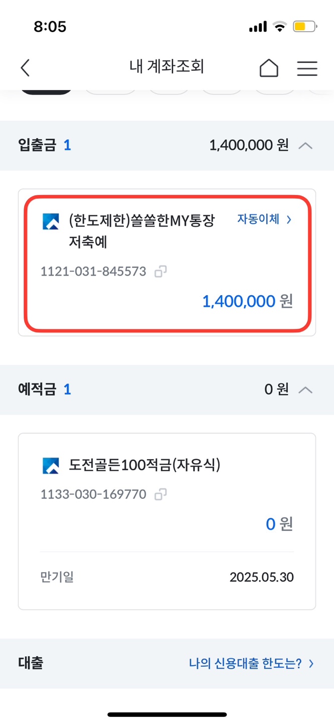 • 입출금 계좌, 도전 골든 100 적금 계좌 2개 계설