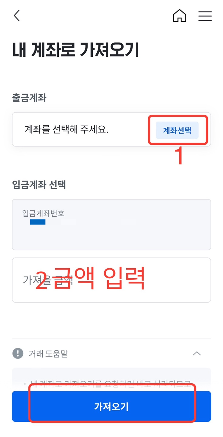 위의 화면처럼 출금 계좌 선택 후 입금하기 원하시는 금액을 20만 원 이하로 입력하세요. 마지막으로 하단의 '가져오기'를 선택하면 납입이 완료됩니다.
