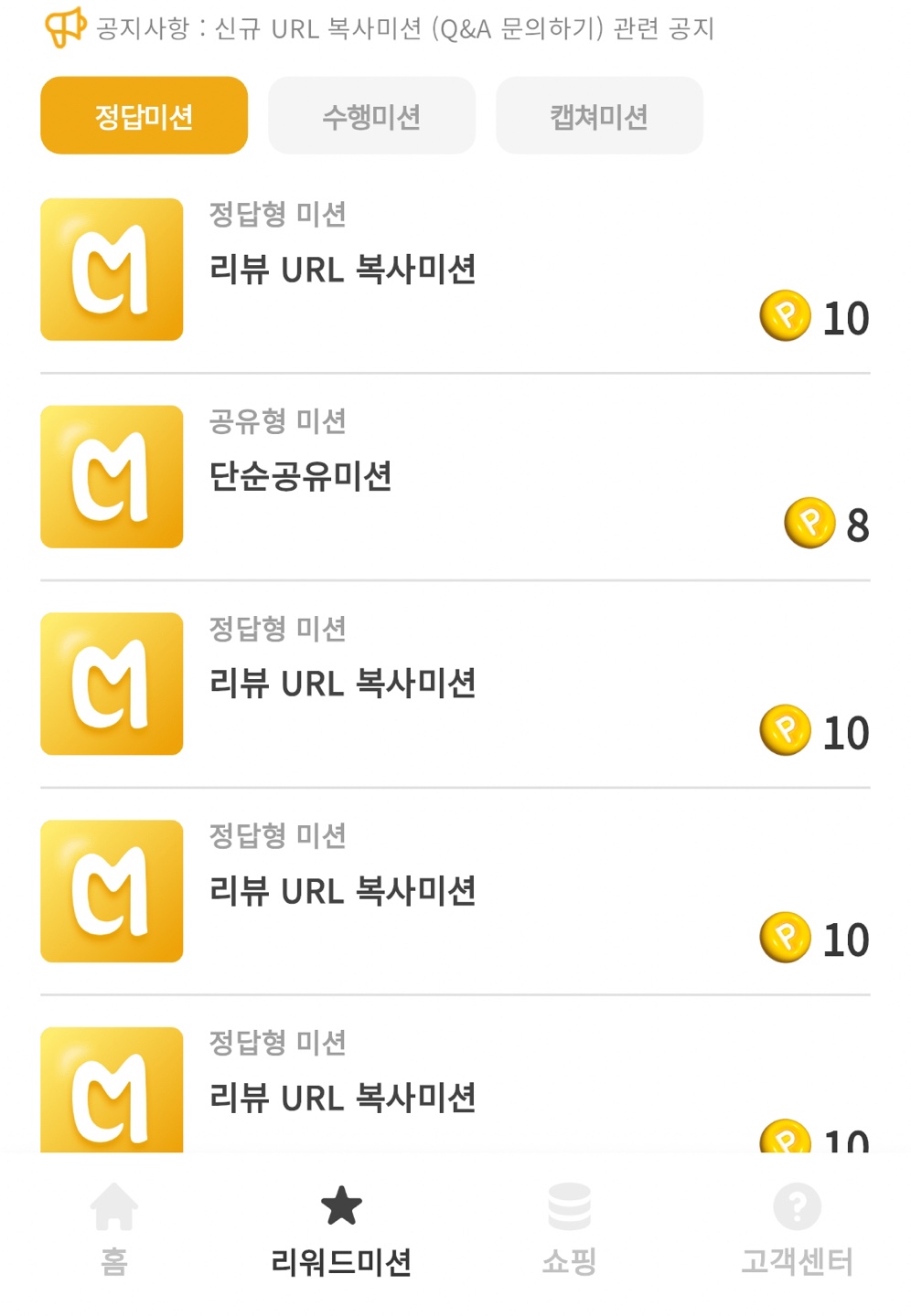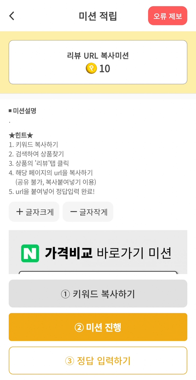 정답미션은 캐시멜로우 제휴 업체 스토어 URL을 복사해서 '정답'창에 붙여넣기만 하면되는 단순한 미션입니다. 타인에게 공유하는거 아니고, 캐시멜로우 앱 '정답'을 입력하면 되는거라 부담 없습니다.
