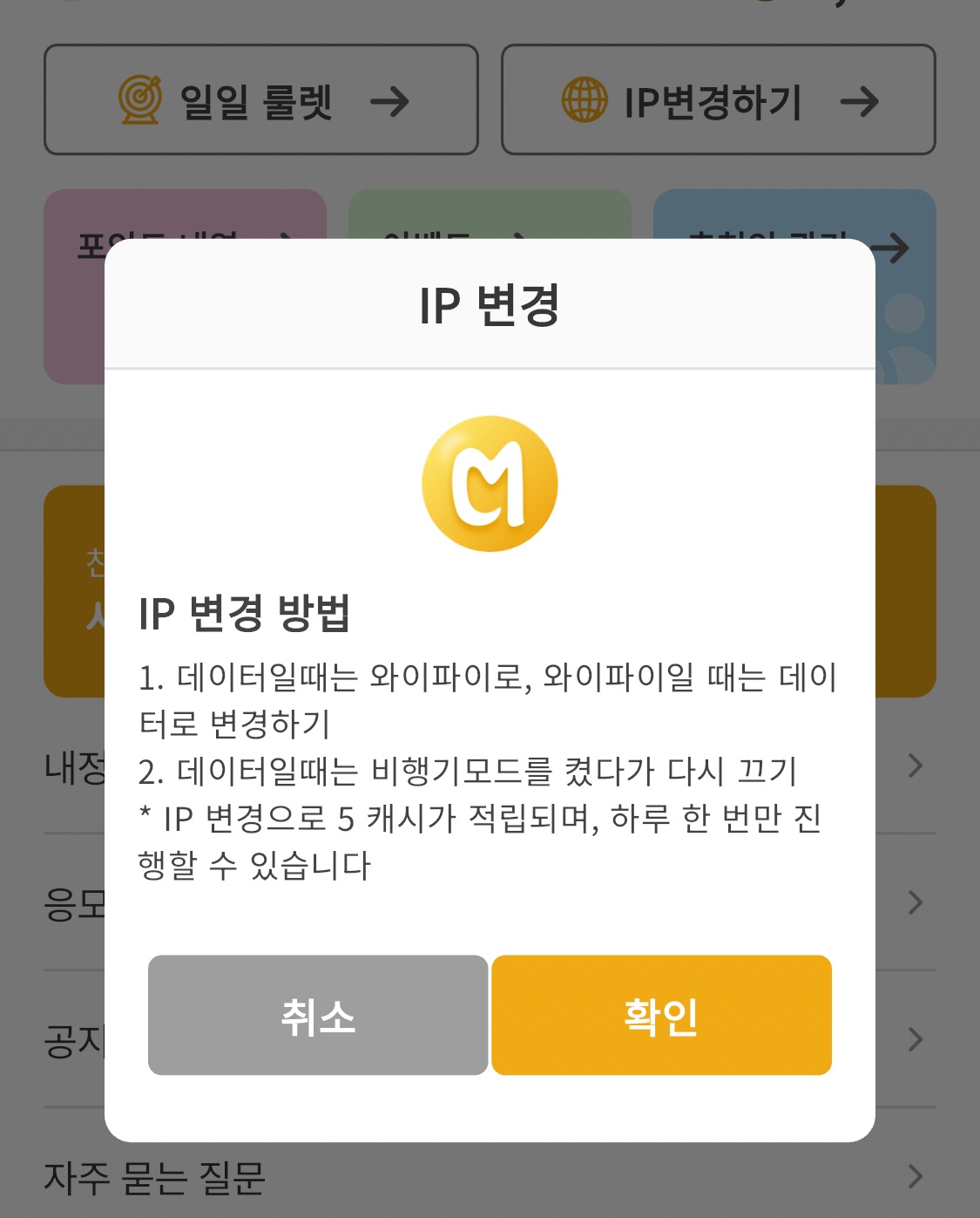 - IP변경 보상 | 1초만에 수행 가능한 미션으로, 와이파이 버튼을 살짝 껐다 켜면 보너스처럼 지급됩니다.