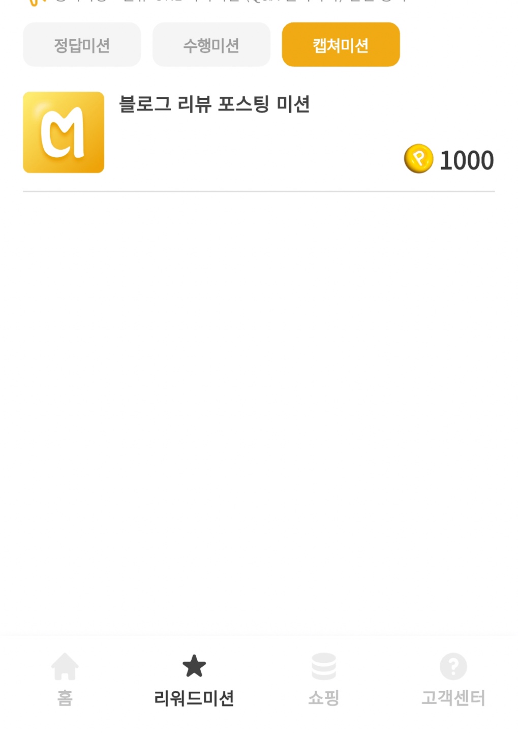 캐시멜로우는 주요 미션 세 가지로 나눠져 있어요. 그 중 '정답미션'비율이 99%입니다. 나머지는 수행미션과 캡쳐미션인데, 있을 때 마다 해주시면 됩니다. 하나하나 알려드리겠습니다.