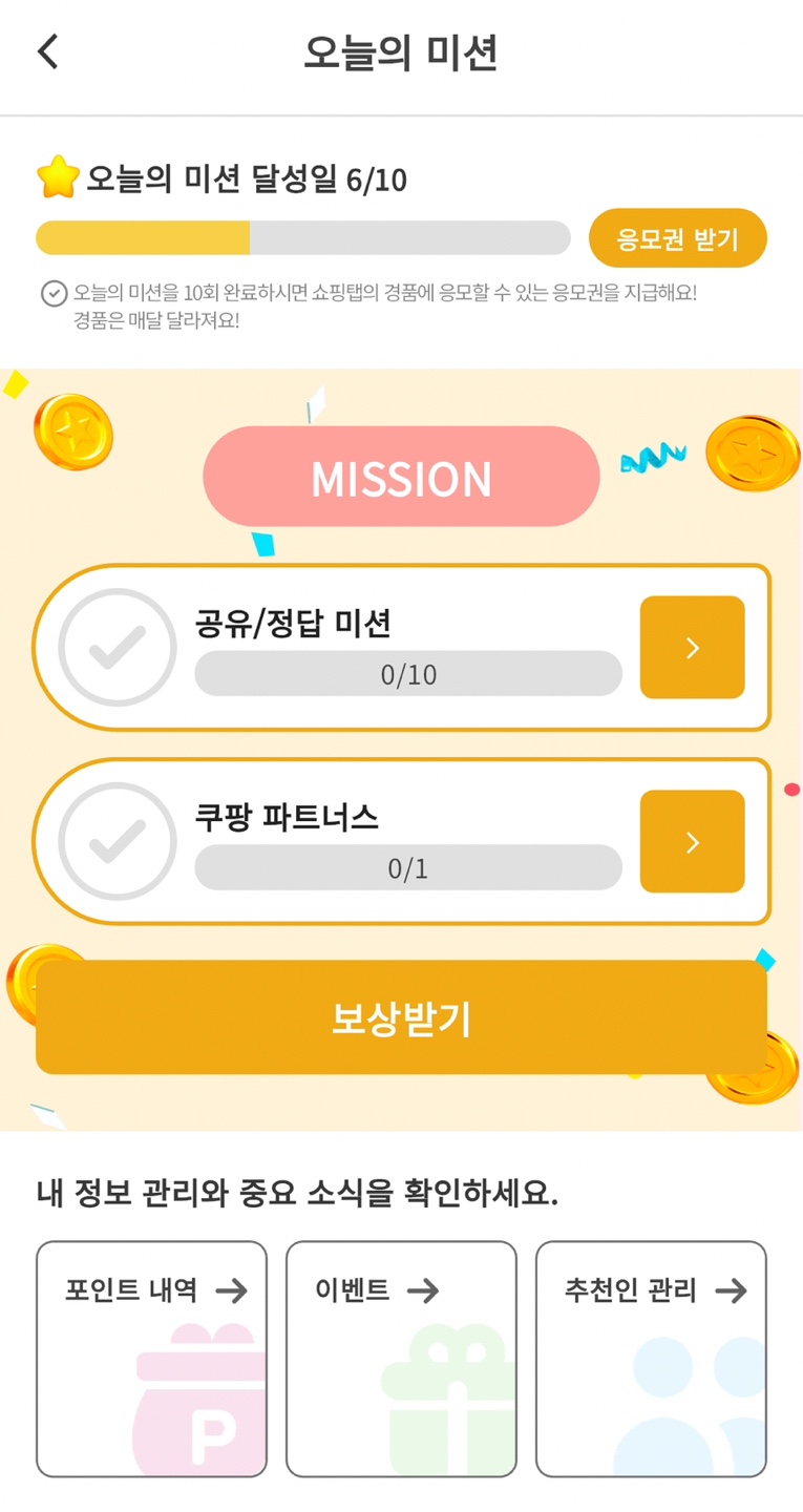 '오늘의 미션'은 정답미션 10개와 쿠팡 파트너스 미션 1개로 구성되어 있어요. 정답미션은 앞서 소개드린 URL복사 미션입니다. 쿠팡파트너스는 쿠팡에 한 번 들어갔다 나오면 되는 간단한 미션이예요. 오늘의 미션 완료하면 10포인트가 추가 지급되며, 10회 달성 시 응모권까지 받을 수 있습니다.