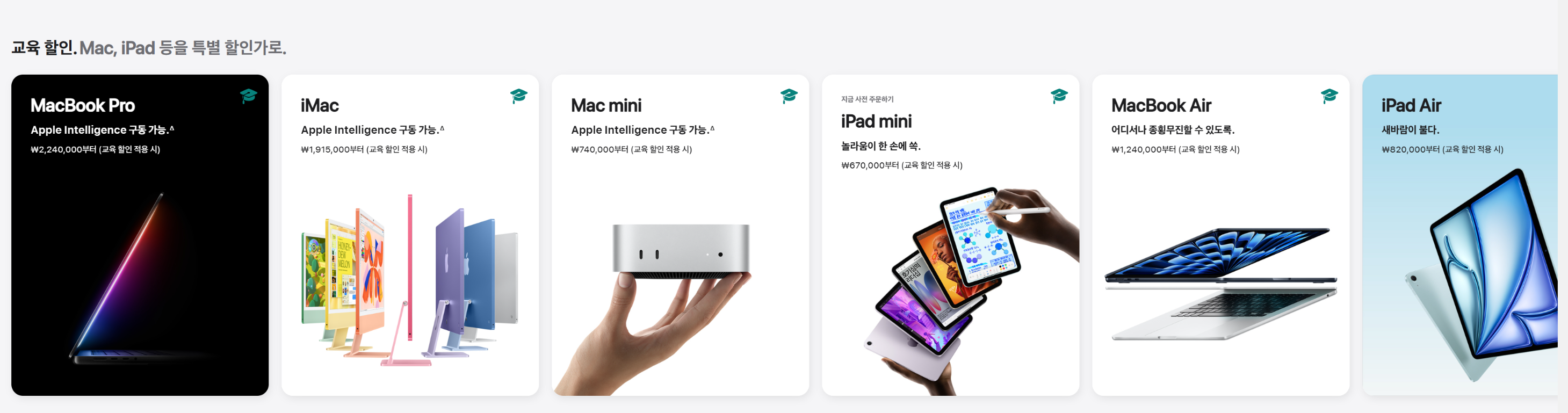 애플 제품은 비용이 만만치 않은 만큼 교육할인, 신학기 프로모션, 리퍼비쉬 제품, 카드 할인 등 상황에 맞는 방법을 적절히 활용하는 것이 도움이 될 것 같습니다.