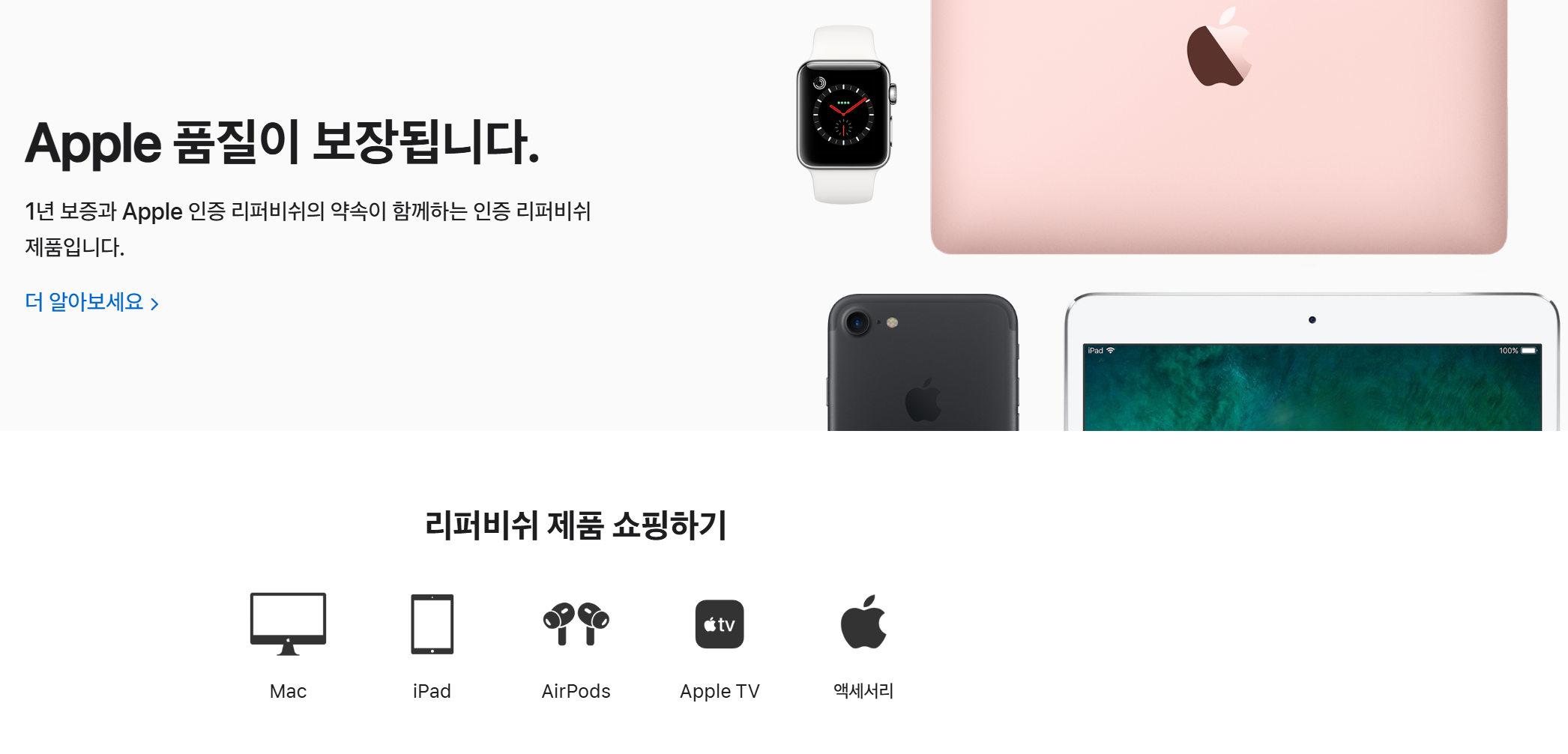 리퍼비쉬 제품은 중고라는 느낌이 들어서 꺼리시는 분들도 있을 겁니다. 그러나 애플 리퍼비쉬는 공식적으로 검수 후 판매하는 제품이라 성능이나 품질은 새것과 다를 바 없다고 해요. 공식적으로 검수하니만큼 모든 부품을 정품으로 사용하고 새 제품과 동일한 1년 보증기간도 있답니다.